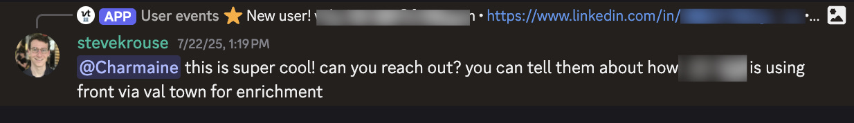 Our best channel was obviously new users signing up for Val Town. However, scrolling through emails and hoping we recognize someone quickly became unsustainable. (And really it only works for celebrities anyways.)
