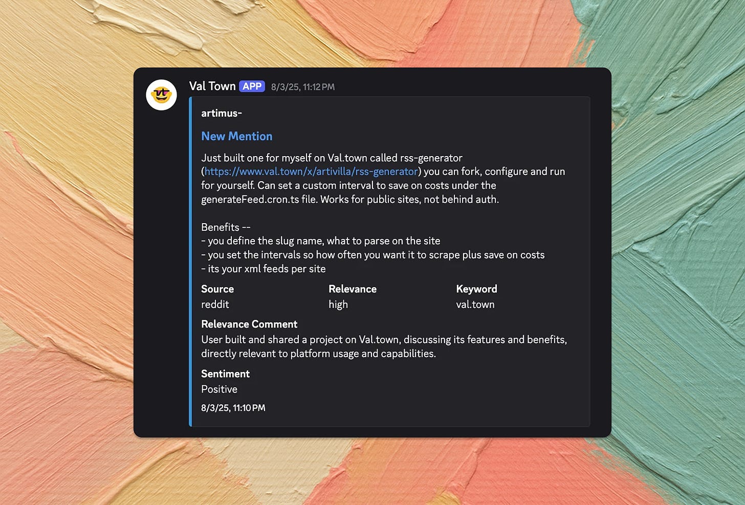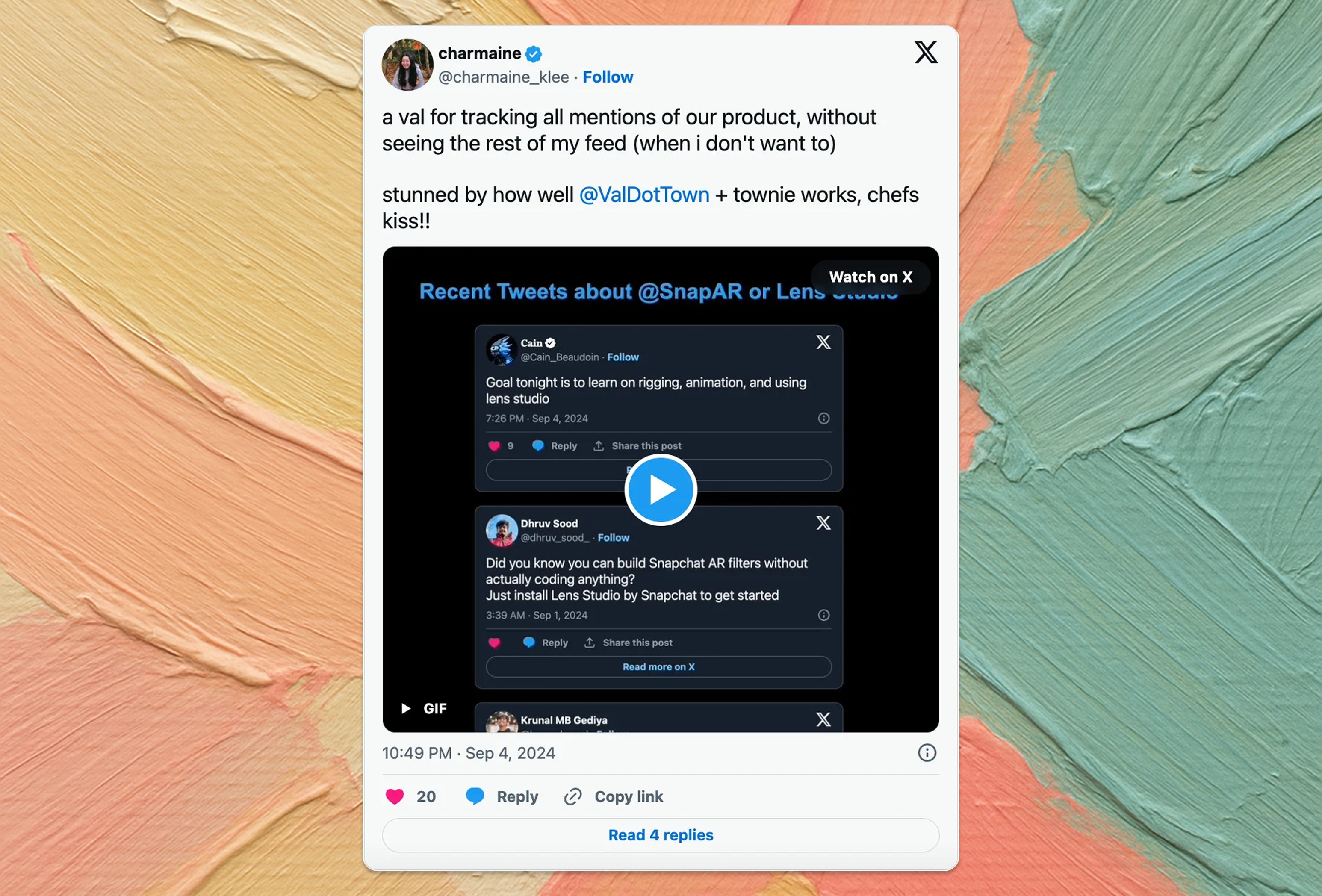 At Snap, I built an app using Val Town and SocialData (Twitter API proxy) to track mentions for teammates who didn't use Twitter. Twitter's official API costs ~$200/month, hence the proxy.